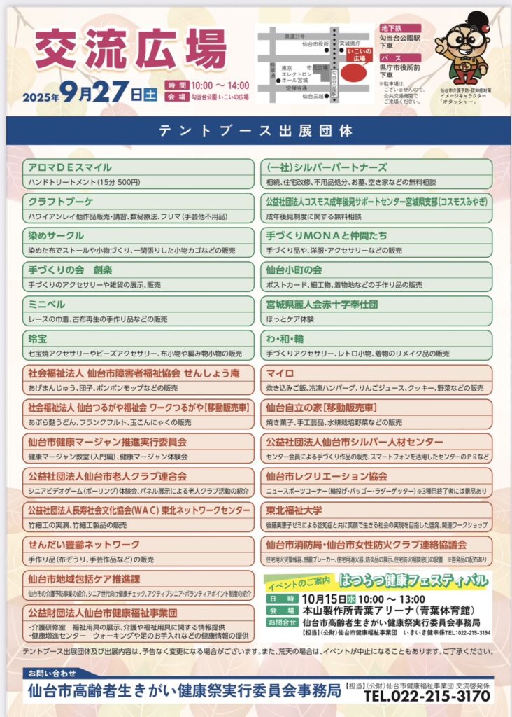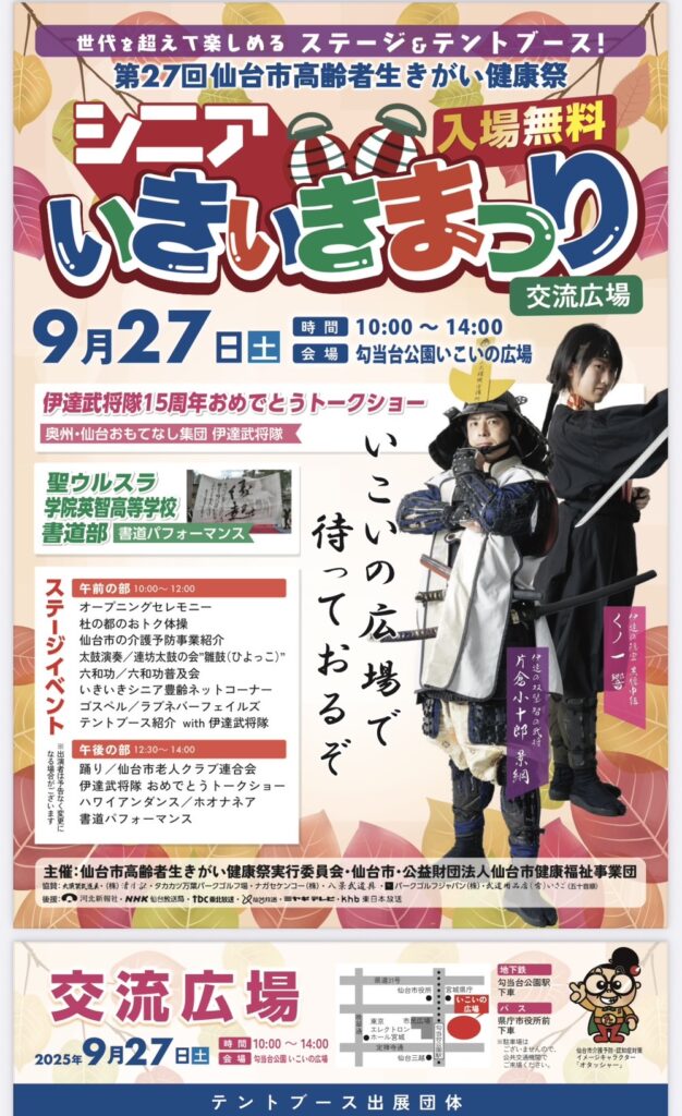 明日9月27日(土)10時~14時、勾当台公園にて「シニアいきいきまつり」(主催:仙台市他)が開催されます。