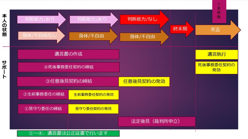 「見守り契約」+「生前事務委任契約(財産管理委任契約)判断能力がある場合)」(財産について)+「任意後見契約(判断能力がなくなった後)」